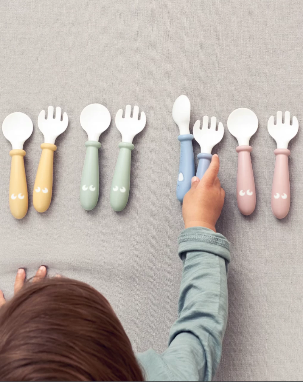 The groove on the back of the handle means that the Baby Spoon and Fork will rest against the edge of the plate between bites, instead of sliding down into the plate. The blades of the spoon and fork are slightly raised to help nudge the food into the child’s mouth.