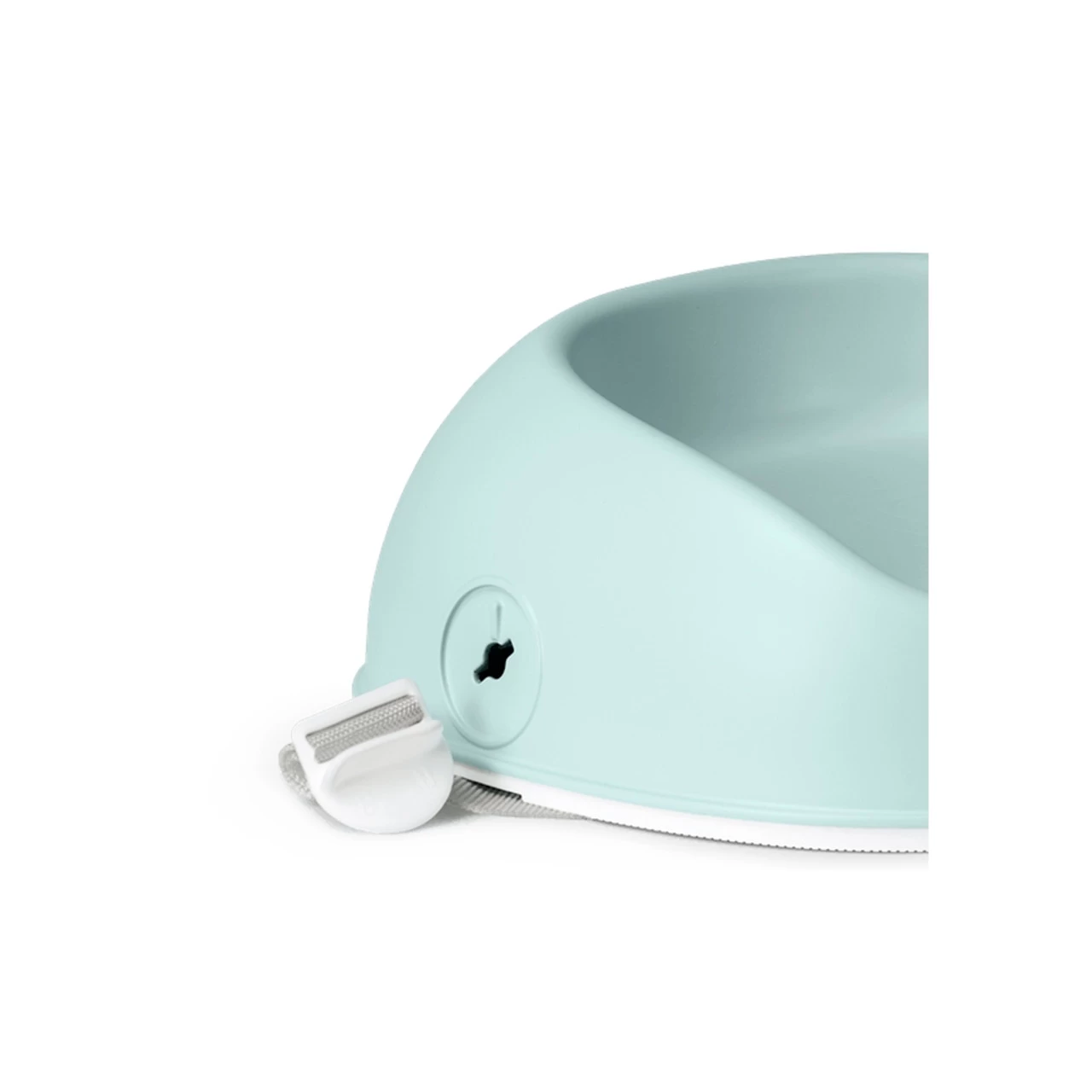 The booster seat rests firmly on the chair and is held in place by a sturdy strap. The strap has a childproof buckle for added safety. - Rubber strip for good grip