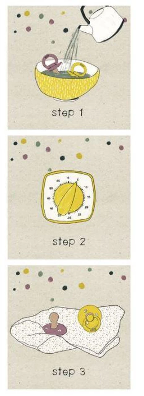 TIP: When the child is over 3 months old, you can also rinse the pacifier by placing them in a sieve and pouring them with boiling water. This method is partly faster and partly avoids water collecting inside the seat part.