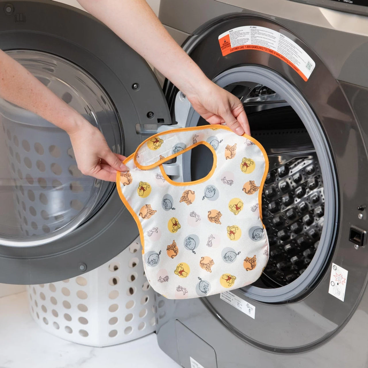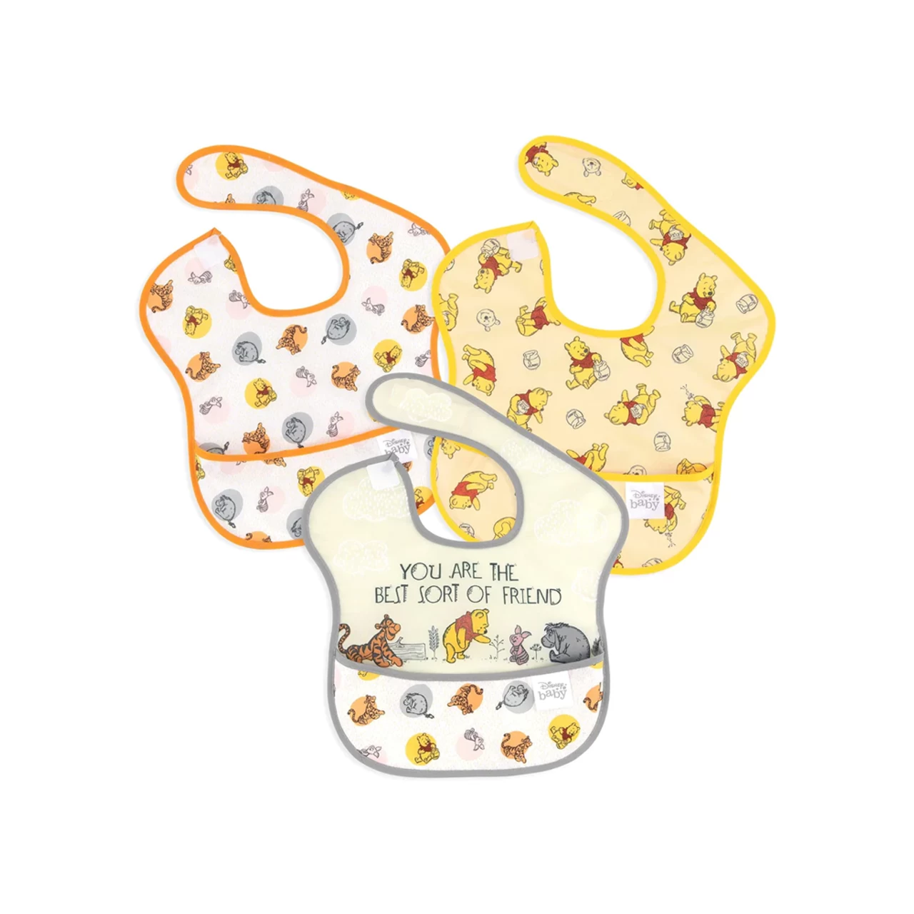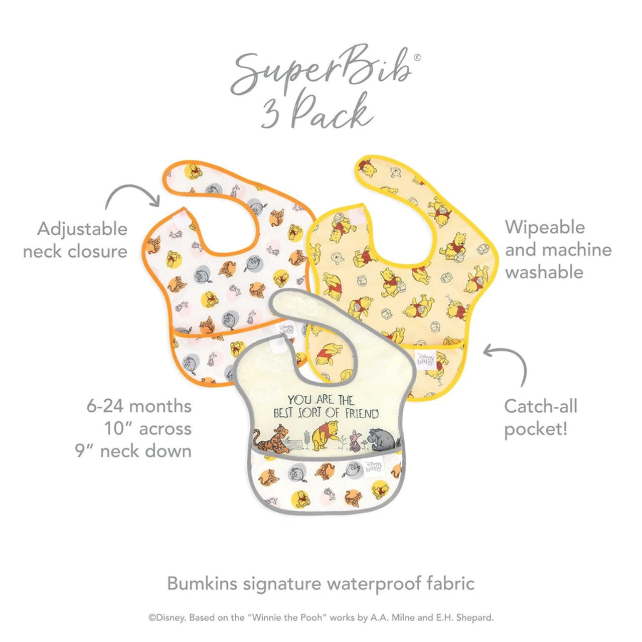Bring Winnie the Pooh and his besties to the table in this set of SuperBibs. Each SuperBib attaches over the back of the shoulder with hook-and-loop closure for a quick, adjustable, and tug-proof fit and features a large catch-all pocket to help contain spills, crumbs, and more. The SuperBib is made from Bumkins’ lightweight, durable, waterproof fabric that is resistant to stains and odors. Its single-ply construction means no worrying about icky stuff growing between layers of fabric. Wipeable and machine washable, this bib is easy to clean, and a pack of three ensures you always have a clean one handy!