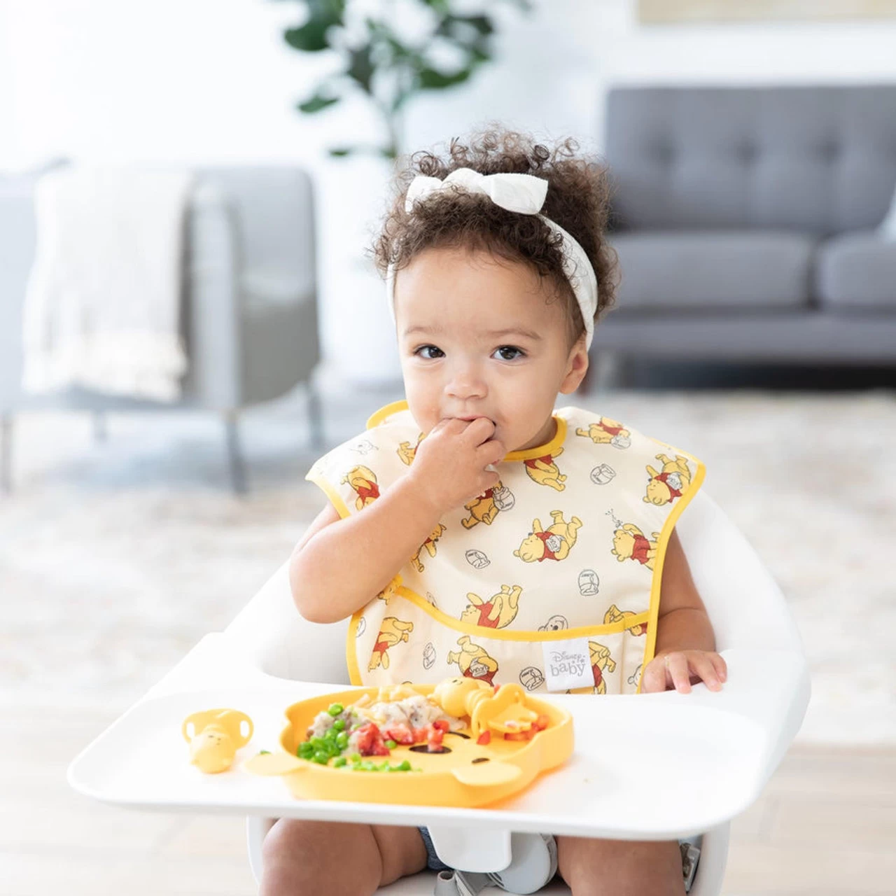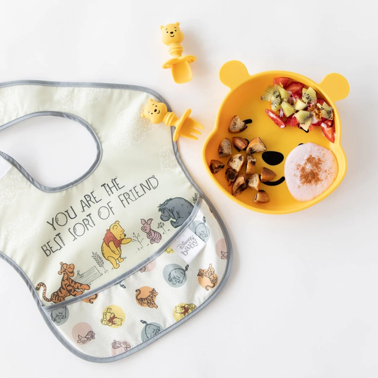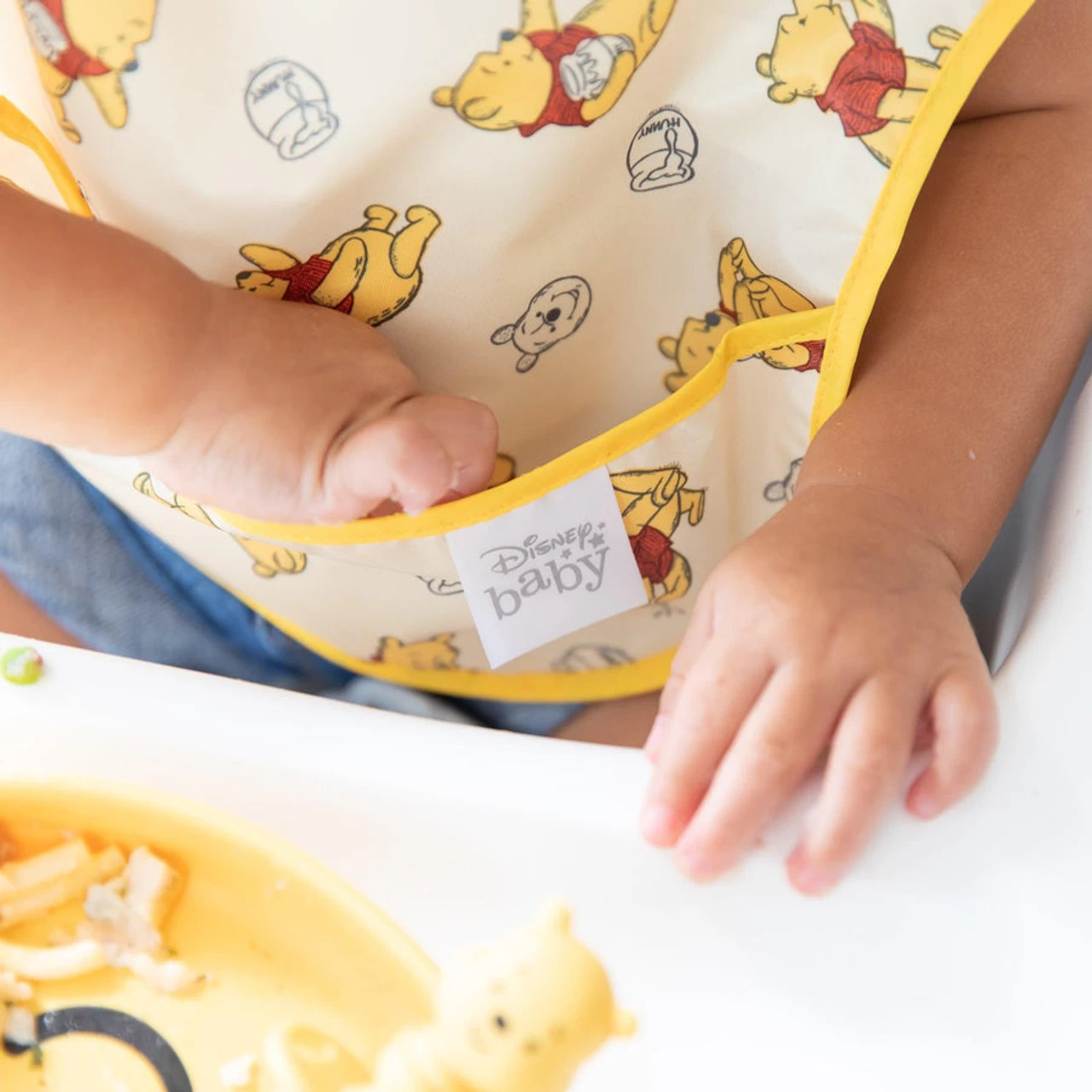 Bring Winnie the Pooh and his besties to the table in this set of SuperBibs. Each SuperBib attaches over the back of the shoulder with hook-and-loop closure for a quick, adjustable, and tug-proof fit and features a large catch-all pocket to help contain spills, crumbs, and more. The SuperBib is made from Bumkins’ lightweight, durable, waterproof fabric that is resistant to stains and odors. Its single-ply construction means no worrying about icky stuff growing between layers of fabric. Wipeable and machine washable, this bib is easy to clean, and a pack of three ensures you always have a clean one handy!