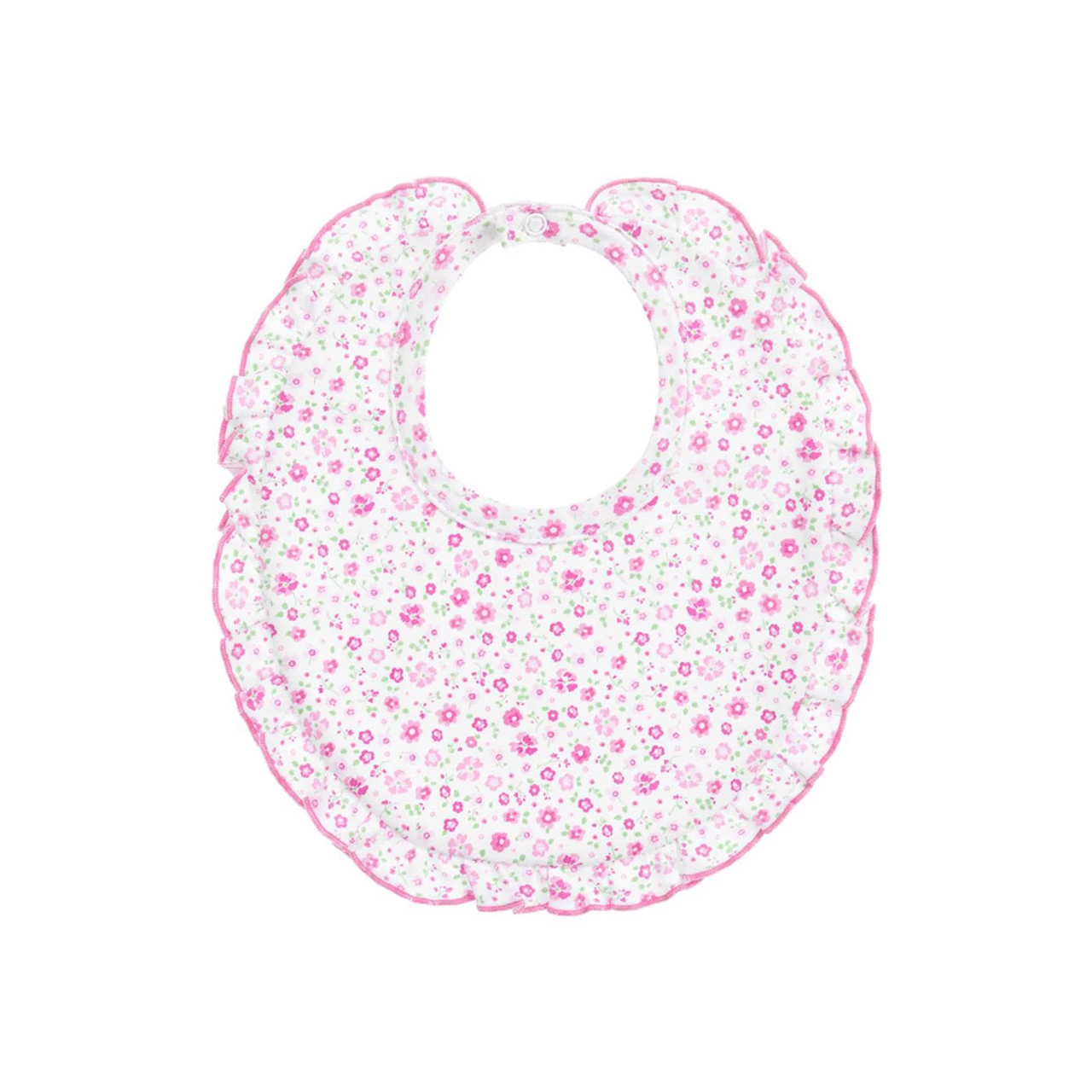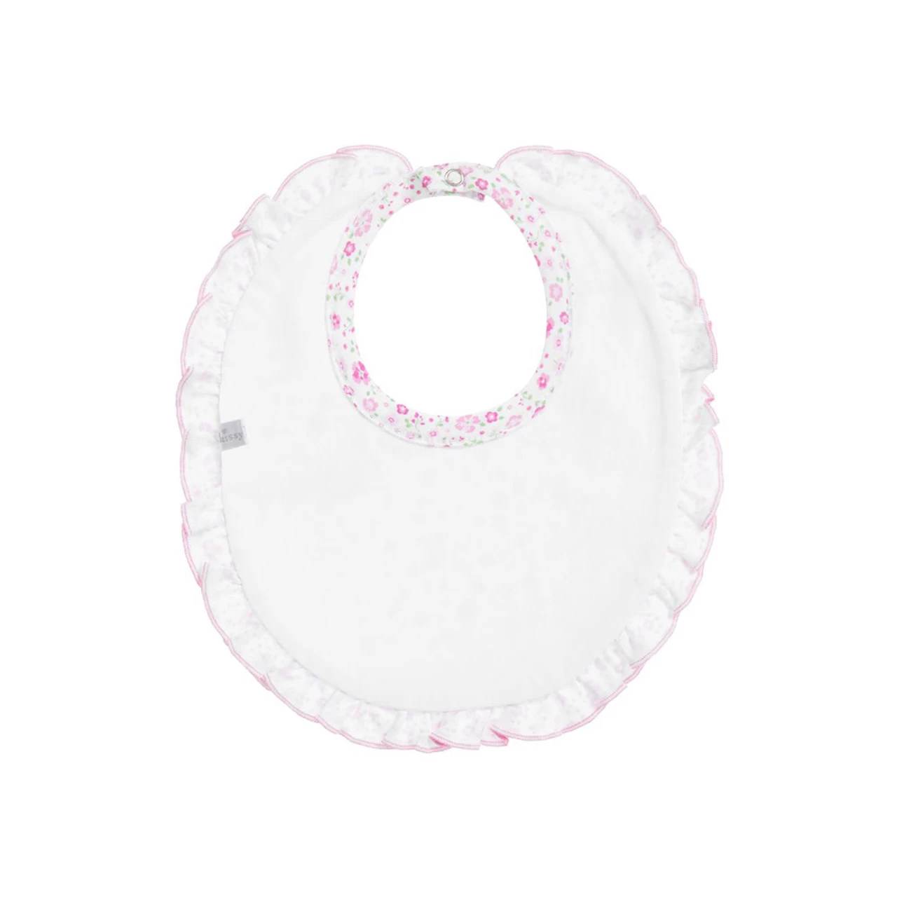 Sweet bib for baby girls by Kissy Kissy, made in super soft Pima cotton jersey. It has a ruffle trim and the white background has a pretty floral print in pink and green.