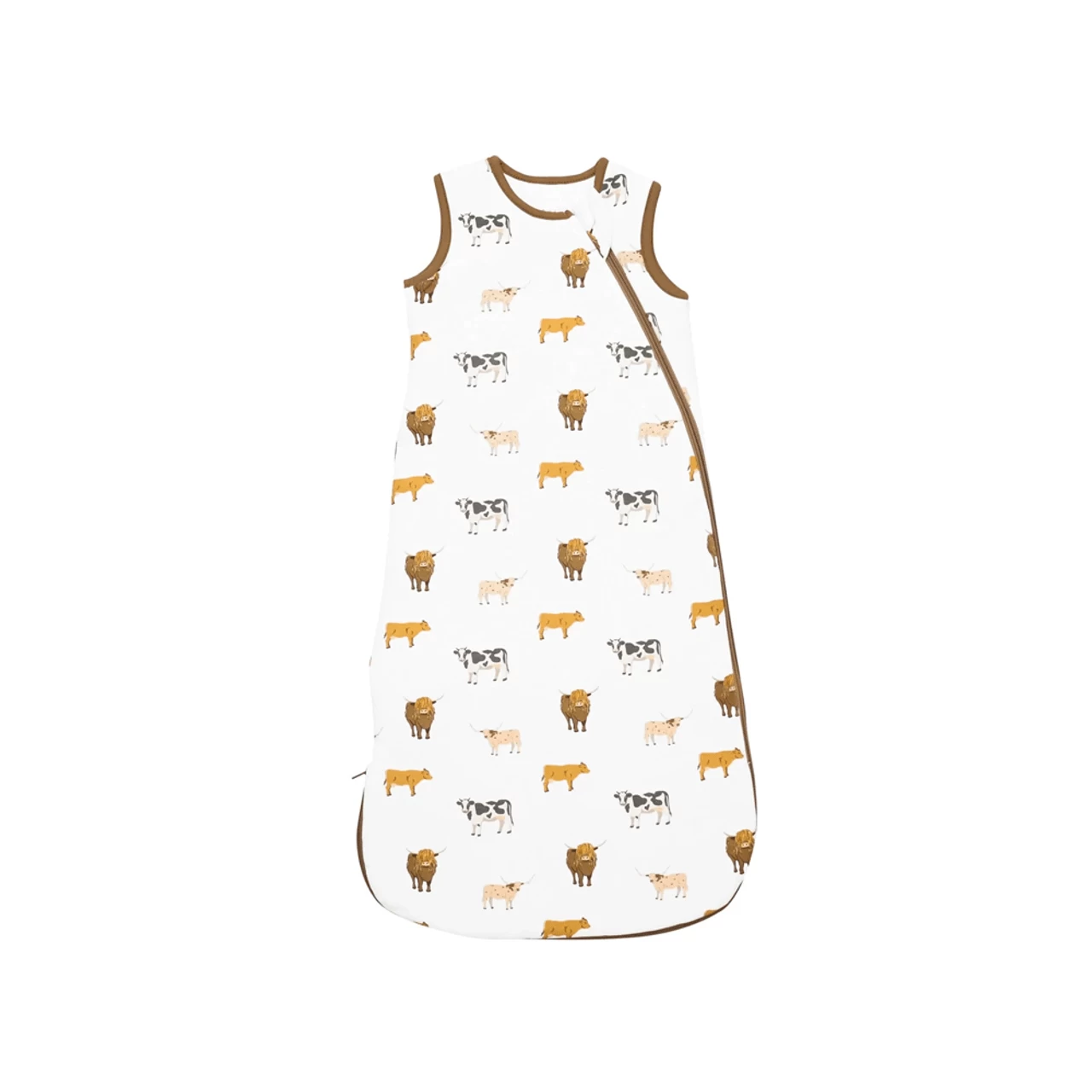 A large, all-over print featuring various breeds of cattle. A traditional Holstein cow colored in black and white, a Jersey cow colored in a yellow ochre, a Longhorn cow colored in a pinkish beige with brown spots, and a brown Highland cow with its characteristic long hair colored in yellow ochre are all laid over a white background