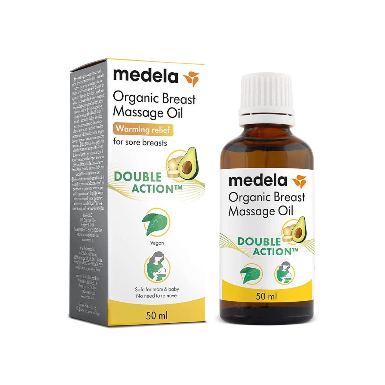 Experience relief from breast tenderness and fullness with Medela organic breast massage oil. Thanks to the nourishing and warming Double Action of avocado oil and ginger, this breast massage oil provides relief to sore breasts when massaged on the skin with circular movements. Specially formulated for breastfeeding mothers, this all-natural formulation is made with only four of the finest organic ingredients, ensuring the safety of the mother and baby from harmful chemicals. The Massage oil is enriched with a unique blend of nourishing oils, and it is formulated without GMO, palm oil, additives, and fragrances. Because it is safe for the baby it does not need to be removed prior to breastfeeding.