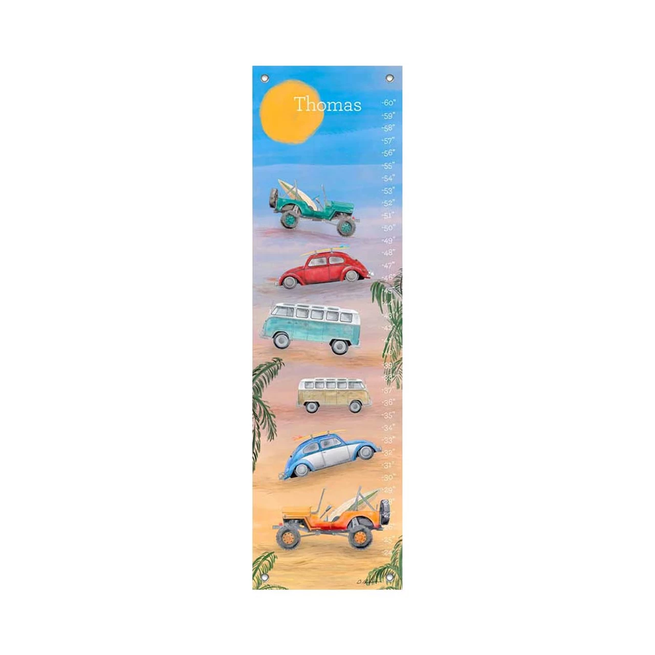 Capture a moment in time – and your child’s measured milestones – with creatively designed canvas growth charts that double as a great keepsake and roll up easily for safe storage. Personalize them with your child’s name for an extra special touch! Our growth charts are made in our San Diego studio on the same artist’s canvas as our stretched wall art. Grommets placed in the four corners make hanging a cinch, plus we provide color-coordinated decorative covers that fit over your drywall screw for a polished look. Wipe up any sticky fingerprints or dust with a soft, dry or damp cloth. Should the chart wrinkle, the backside can be ironed on a low setting with light steam. A colorful permanent marker (not included) is a great way to record dates or your child’s age on the chart.
