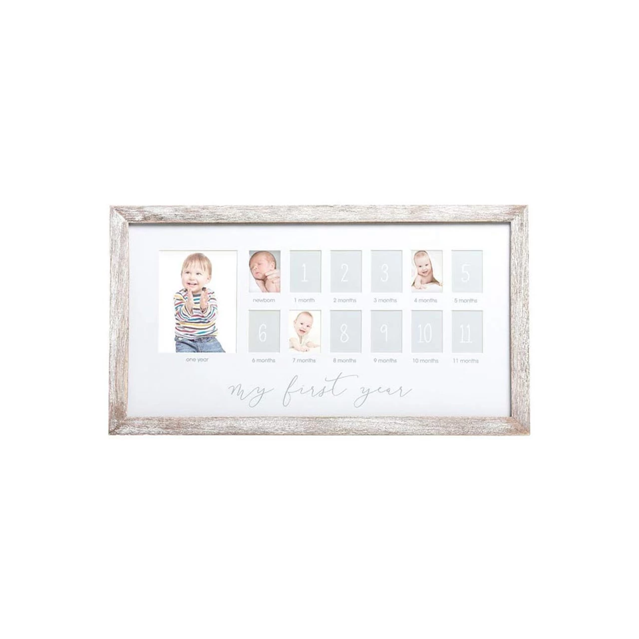 Baby’s first year goes by in an instant! Make sure to capture each and every moment with Pearhead’s first year frame. This rustic, white wooden frame holds 12 1.25” x 1.75” small photos and 1 large 4” x 6” photo to highlight every moment of baby’s first year. An acid-free beveled mat is included to border each picture. Don’t let any adorable, fun, and memorable moment pass you by! Snap a picture each month and add it to the collage or add your pictures all at once and display proudly in your home. “My first year” is printed in gray on the white mat. The mat also includes baby’s age printed below each appropriate picture. This frame is perfect for hanging in your home or in baby’s nursery with the included sawtooth hanger. Don’t forget to add this frame to your baby registry! It makes the perfect gift for anyone who just had a baby or just found out they are expecting. Celebrate every one of baby’s moments with Pearhead’s first year frame.