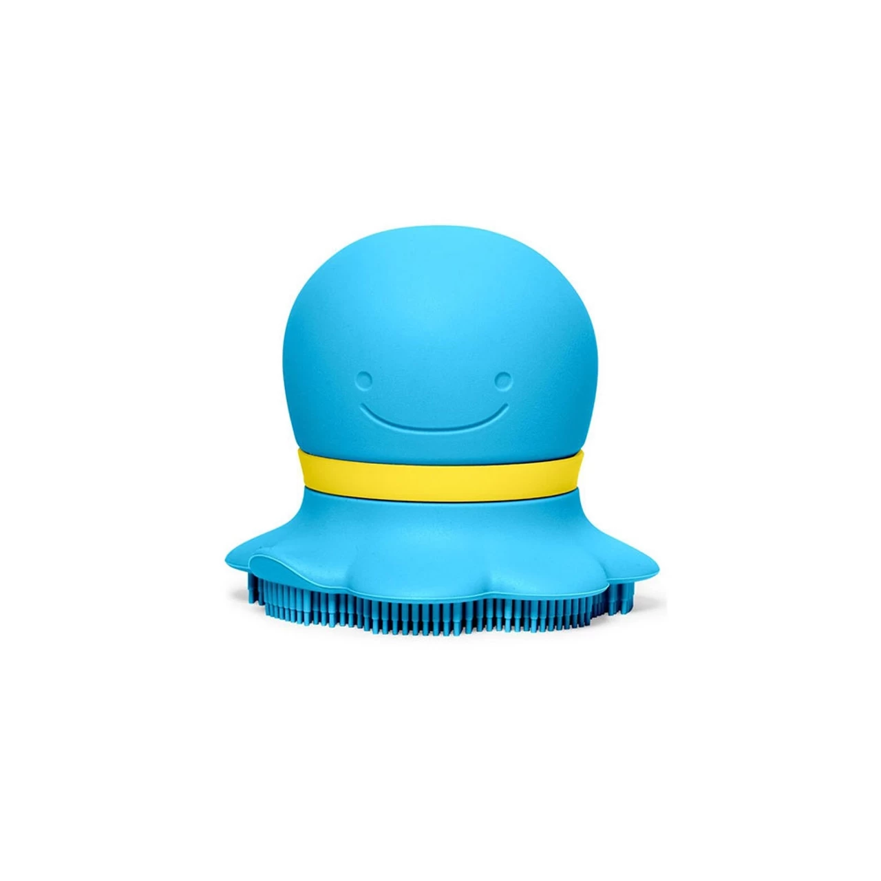 - 2-in-1 scrubber dispenses soap and gently massages skin